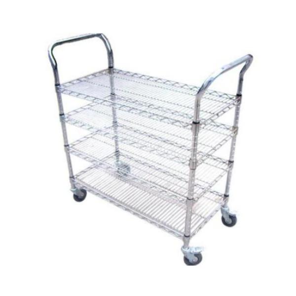 2.Shelving and trolleys feature chrome plated wire shelves;